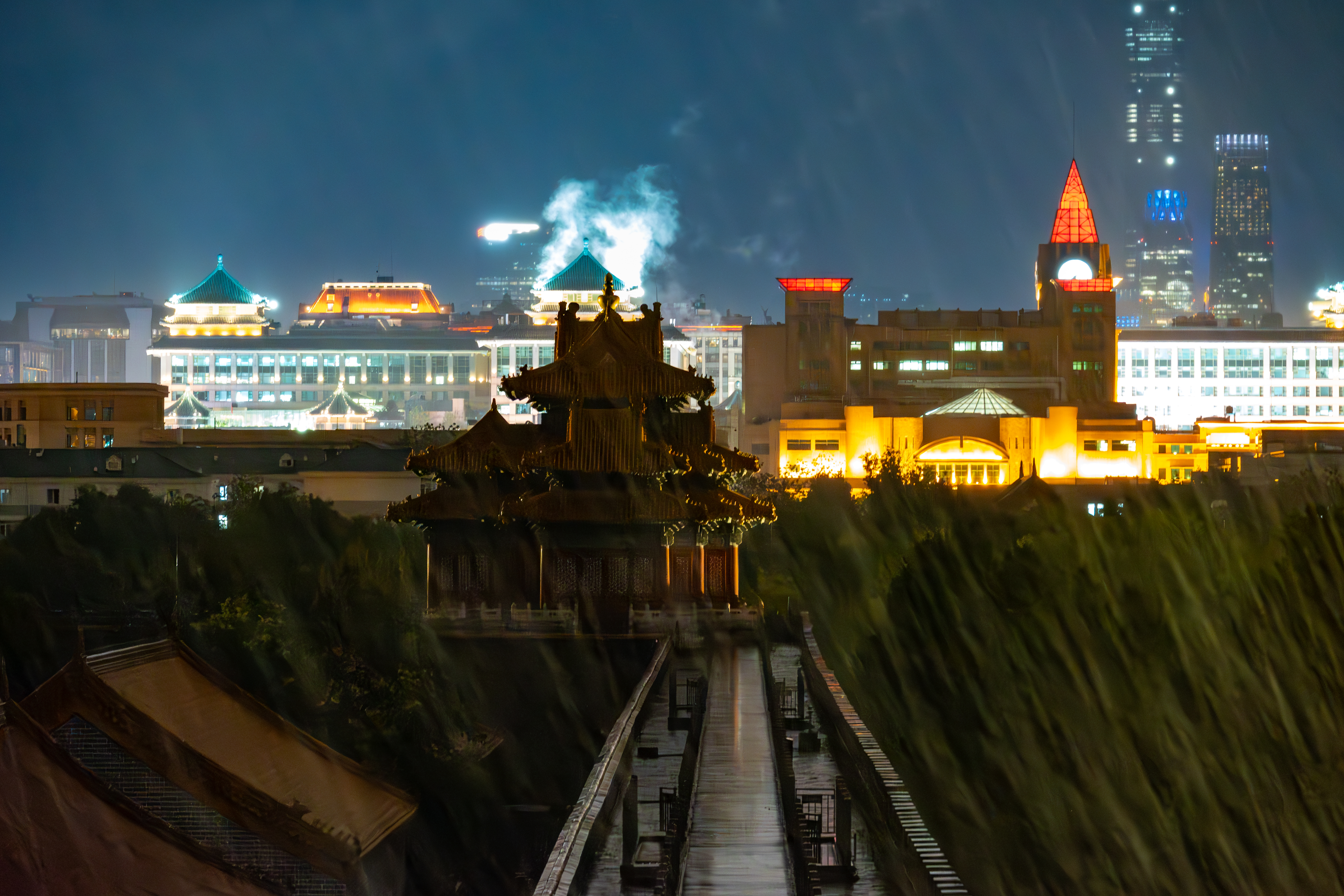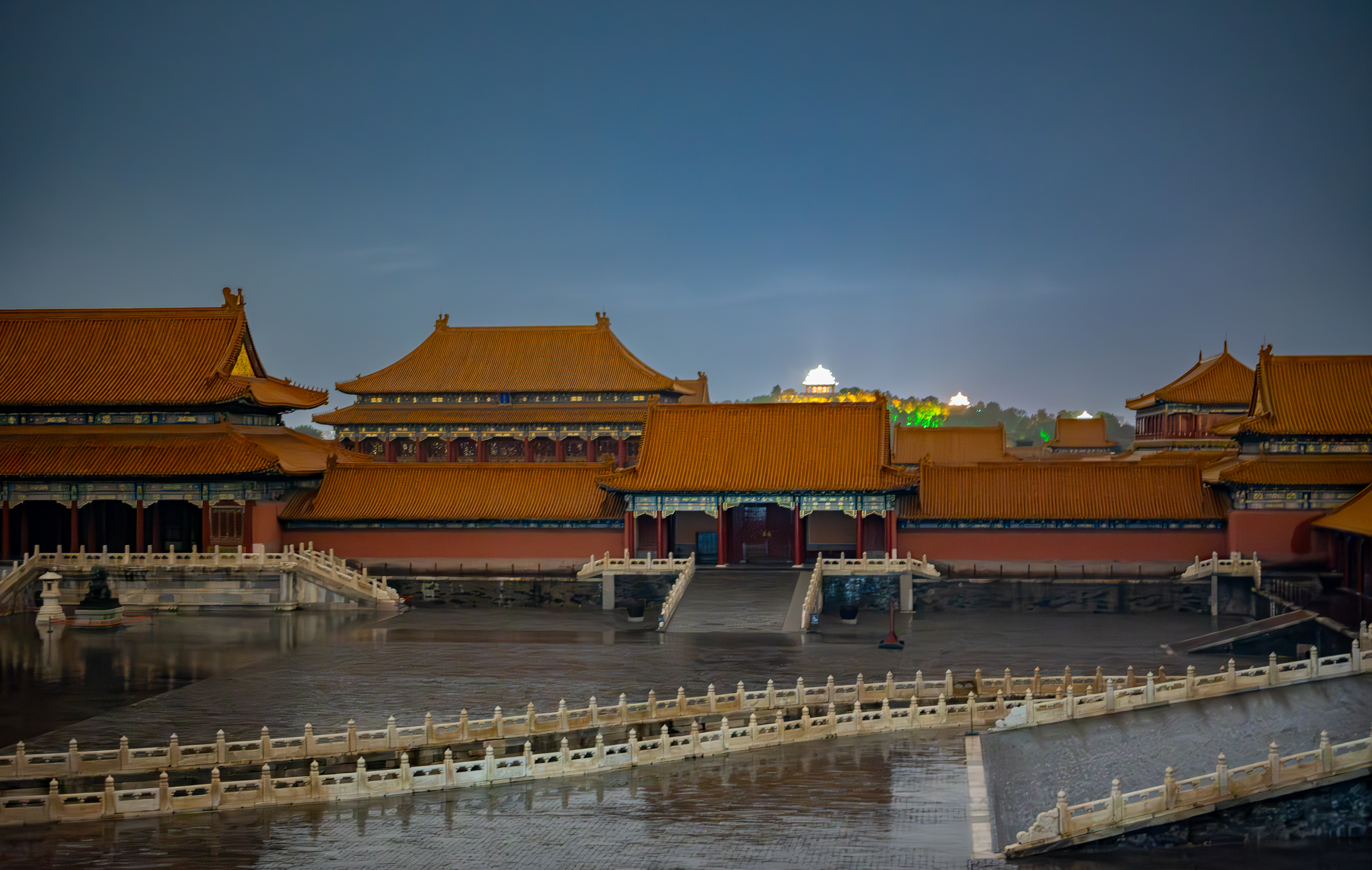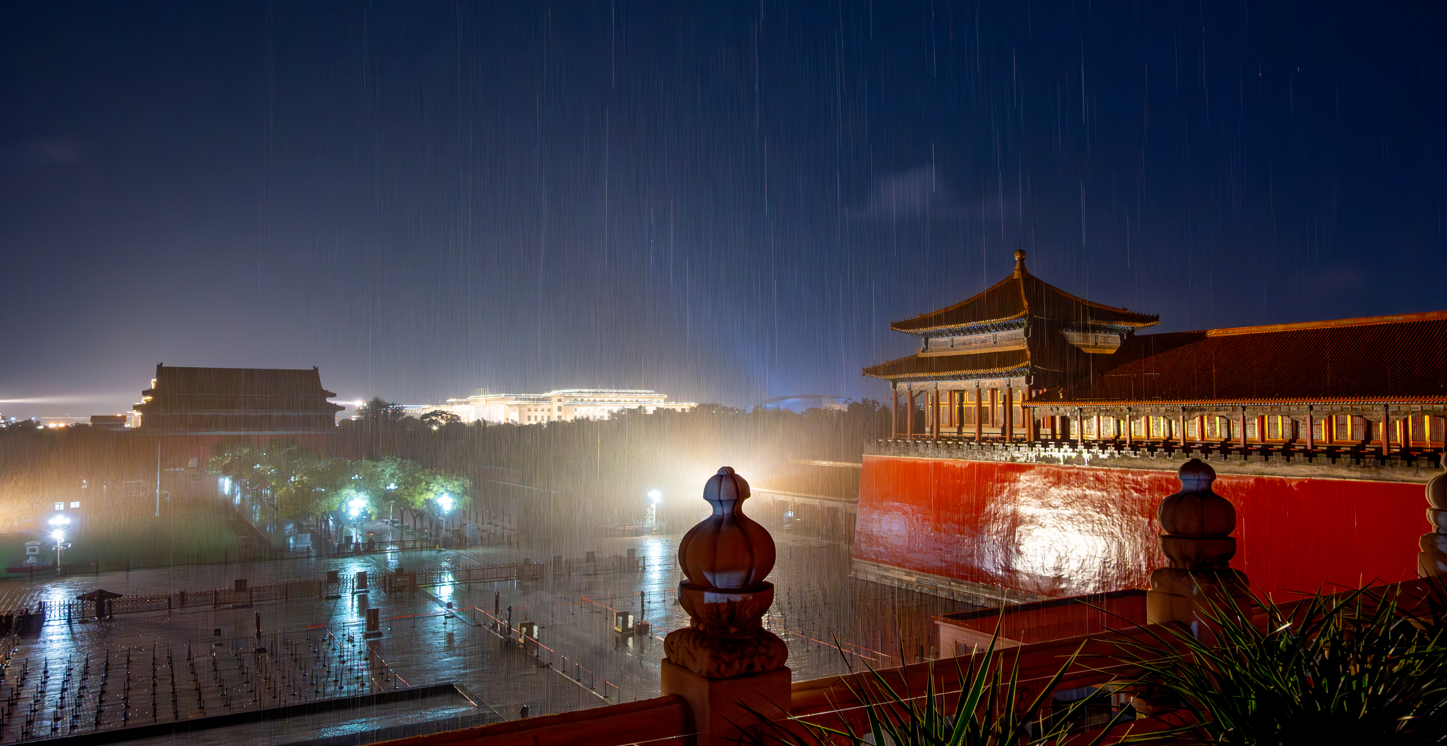看完清明上河图出来,已经是晚上八点的故宫了。平时故宫将会在4点清场——但很幸运,我第一次来故宫就看到了夜色如铅、夜雨淅淅沥沥的故宫。站在午门上远眺端门、天安门和人民大会堂,再向东望向王府井和角楼,最后向北,越过故宫层层叠叠的建筑,甚至能看到景山公园和天坛。