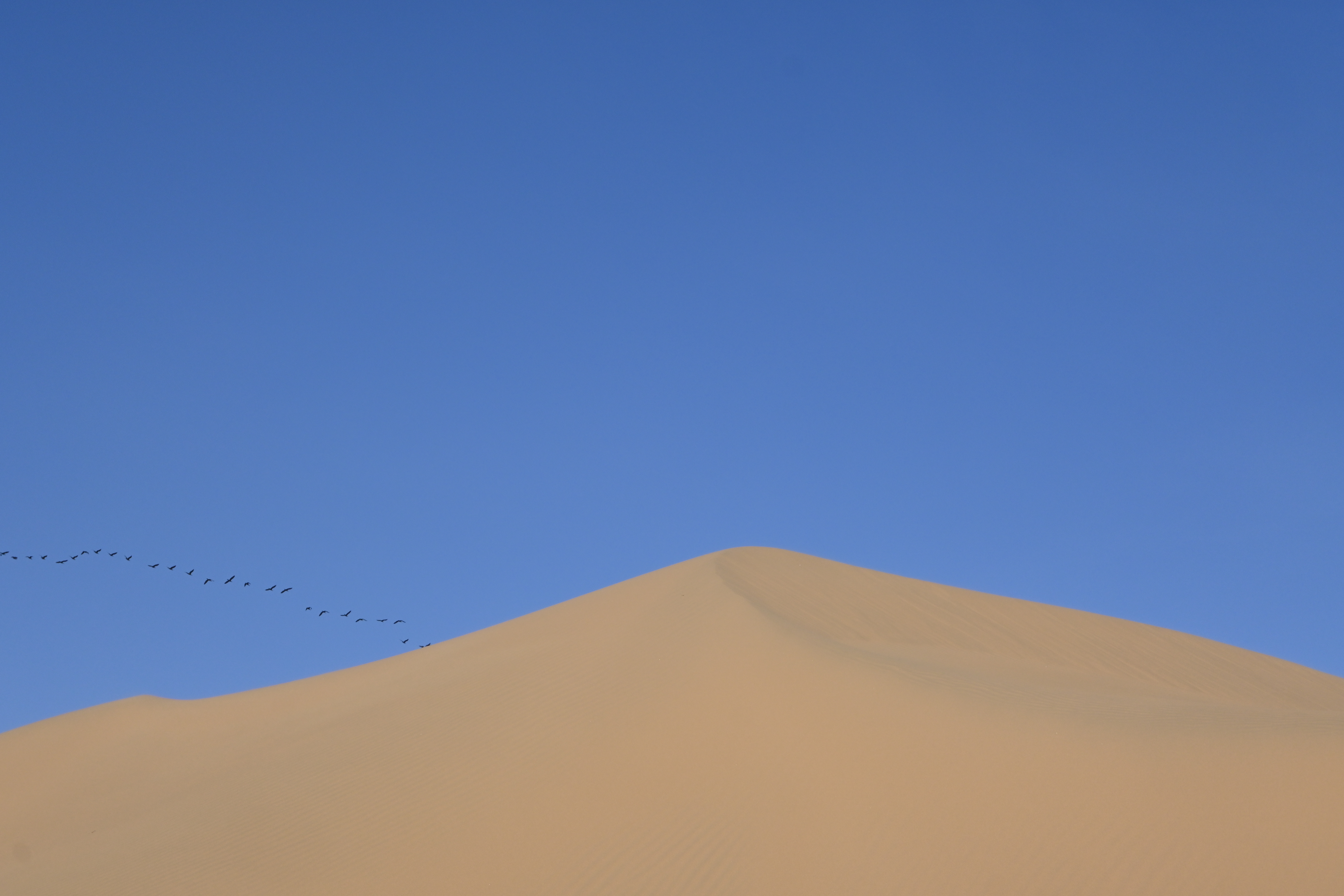 不知道大家怎么能走得那么快,我和SH他们四个人(SY早就自己走了)中间并没有休息,但是在路程中还是掉在了队伍的末端。但慢也是一种幸运,在这里我看到了绝景——一行大雁排成人字形,飞跃沙漠。我的眼前只有湛蓝的天空、金黄的沙丘和大雁。