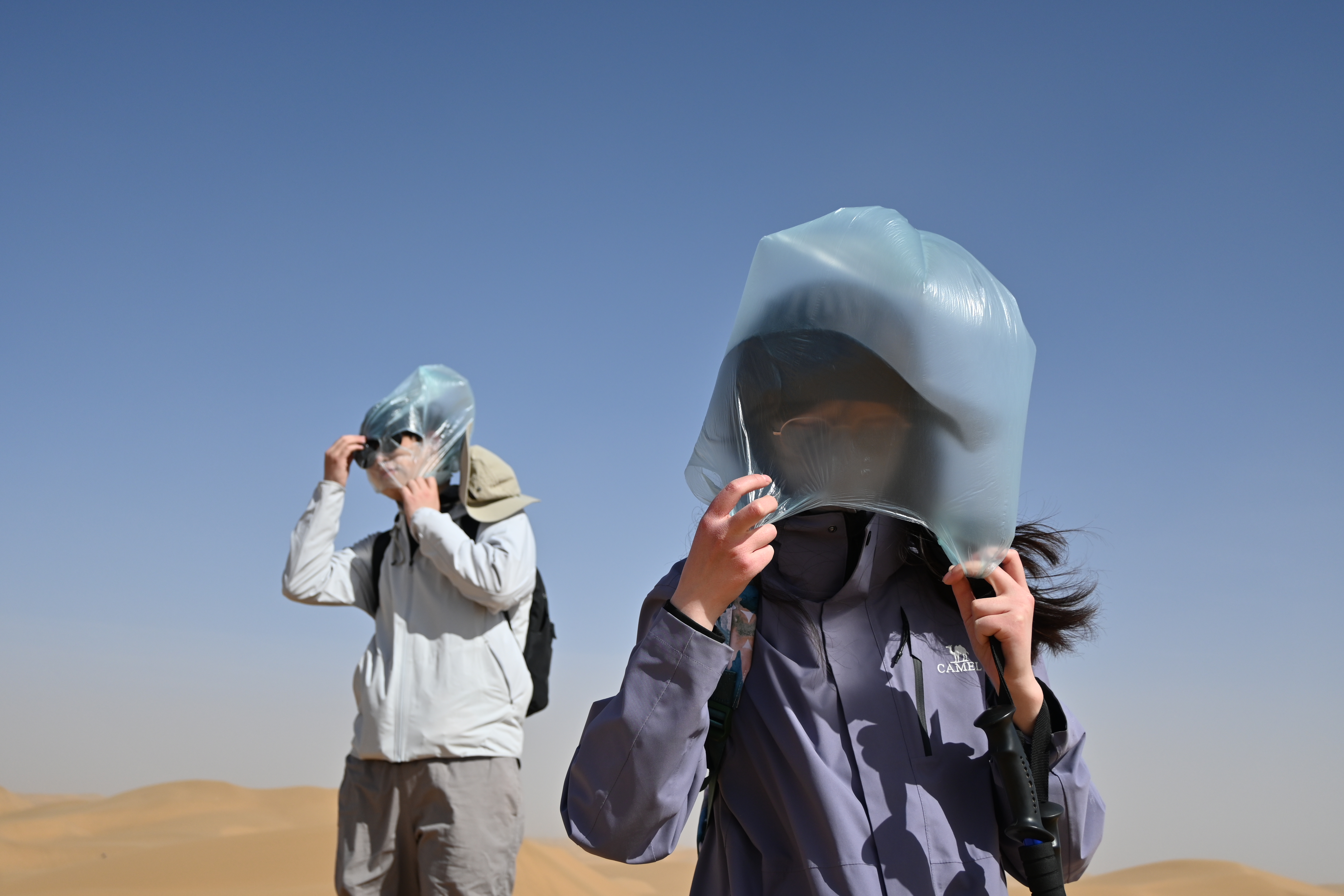 穿上沙套、拿上登山杖、背好相机,「准备出发,全程预计需要4小时」。沙漠里的景色似乎是重复的重复,越过种植的网格形固沙植物后,遇到的沙丘上是细密的沙子,脚往下一踩,就会陷进去,每一步需要耗费平时许多许多倍的力气。